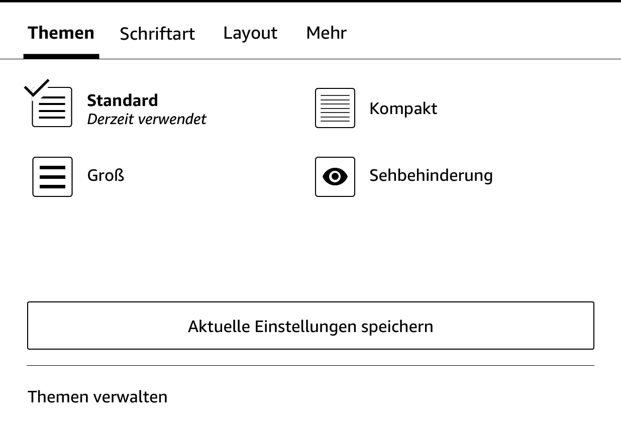 Anzeige- und Textgröße:Du kannst die Schriftgröße für die Benutzeroberfläche deines Kindle ändern, um das Lesen zu erleichtern. Wähle „Standard“, um Standardschriftgröße und -layout zu verwenden. Wähle „Groß“, um die Schrift zu vergrößern und wichtige Bereiche deines Kindle besser lesen zu können. Auf einigen Seiten beeinflusst dies die Menge des angezeigten Inhalts.