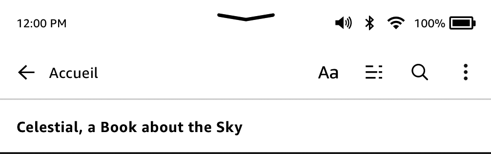 En haut de l'écran d'accueil, vous pouvez voir plusieurs voyants qui vous informent de l'état de votre Kindle Oasis. Pour voir ces voyants lorsque vous êtes en train de lire un livre ou un document, touchez le haut de l'écran afin d'afficher les barres d'outils.