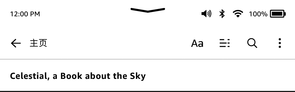 在主页顶端,您会看到若干 Kindle Oasis 状态指示图标。 如需在电子书或文档中查看指示图标,请点击页面顶端以显示工具栏。