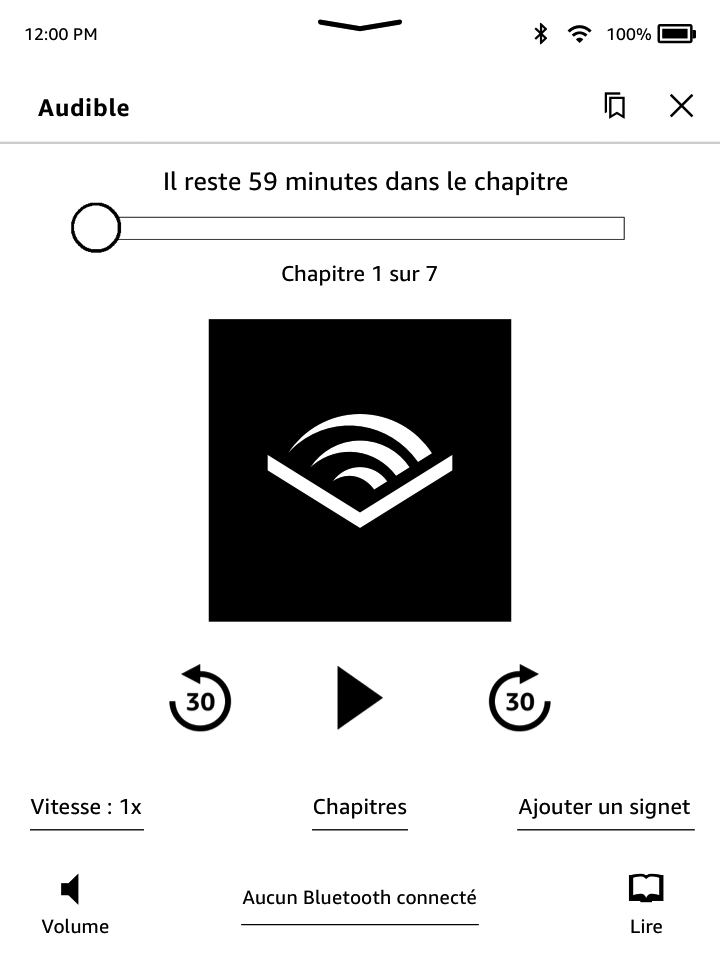 contrôle le volume de votre Kindle. Vous pouvez également contrôler le volume depuis votre appareil Bluetooth, si ce dernier est pris en charge. Pour augmenter ou réduire le volume de votre livre audio, touchez
