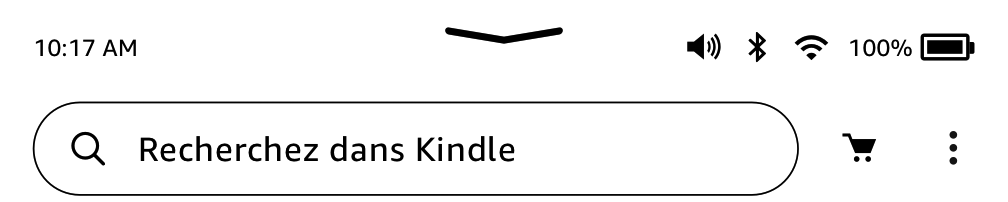En haut de l'écran d'accueil, vous pouvez voir plusieurs voyants qui vous informent de l'état de votre Kindle Paperwhite. Pour voir ces voyants lorsque vous êtes en train de lire un livre ou un document, touchez le haut de l'écran afin d'afficher les barres d'outils.