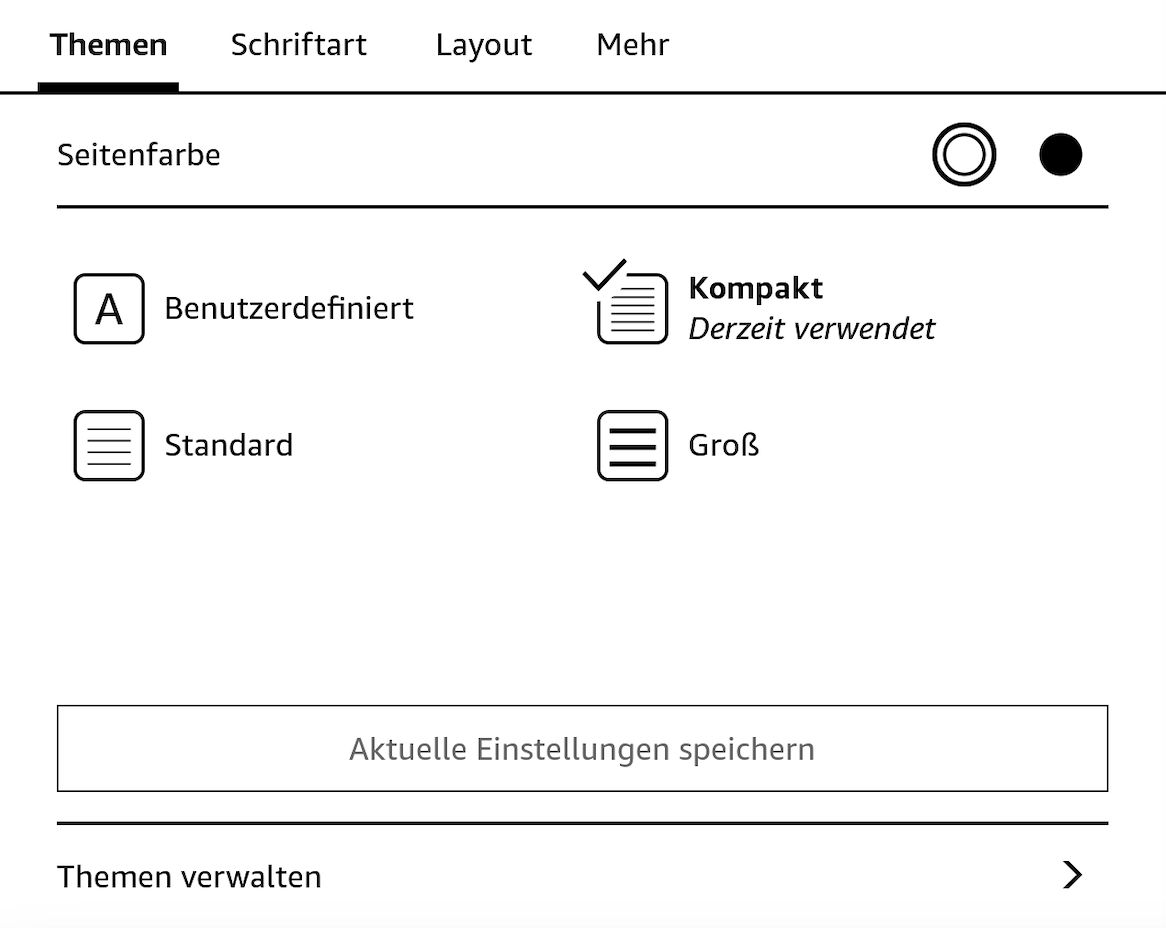 Anzeige- und Textgröße:Du kannst die Schriftgröße für die Benutzeroberfläche deines Kindle ändern, um das Lesen zu erleichtern. Wähle „Standard“, um Standardschriftgröße und -layout zu verwenden. Wähle „Groß“, um die Schrift zu vergrößern und wichtige Bereiche deines Kindle besser lesen zu können. Auf einigen Seiten beeinflusst dies die Menge des angezeigten Inhalts.