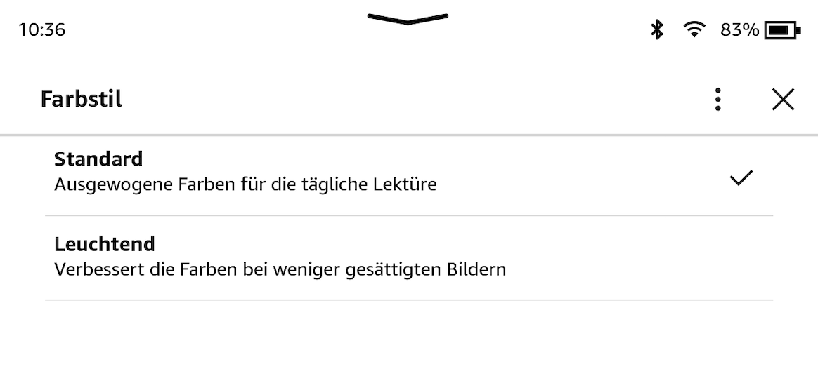 . Tippe auf die Globus-Taste, um eine andere Tastatur auszuwählen.Der Kindle Colorsoft bietet zwei Farbstile: Standard und Brillant. Du findest diese Einstellung unter „Alle Einstellungen“ -> „Bildschirm und Helligkeit“ -> „Farbstil“. Du kannst diese Einstellungsseite auch über die Schnellaktionen aufrufen, indem du auf den Pfeil neben dem Modus tippst, der aktuell eingestellt ist. Der Standardmodus eignet sich hervorragend für das tägliche Lesen und zeigt Bilder mit größter Detailtreue an. Der Modus „Brillant“ verbessert die Farbe in vielen Bildern, sodass sie kräftiger aussehen. Er kann auch zu einigen Bildverschiebungen oder weniger Detailreichtum in einigen Bereichen führen. Probiere beide aus, um herauszufinden, welchen Modus du bevorzugst, da die Qualität der Inhalte vom jeweiligen Modus abhängt..png)