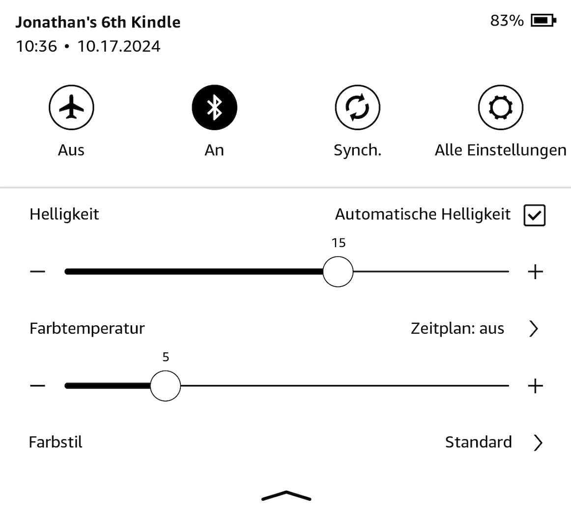 Tippe auf den Bildschirm oder wische nach unten, um rasch Steuerelemente wie Flugmodus, Bluetooth, „Meinen Kindle synchronisieren“ und „Alle Einstellungen“ aufzurufen.