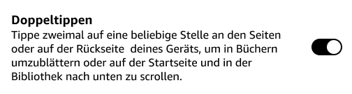 VoiceView-Screenreader: Ermöglicht dir, VoiceView ein- und auszuschalten. Mit dem VoiceView-Screenreader kannst du deinen Kindle mithilfe bestimmter Gesten bedienen, die Sprachsteuerung verwenden, wenn du mit Elementen auf dem Bildschirm interagierst, und Millionen Bücher hören.