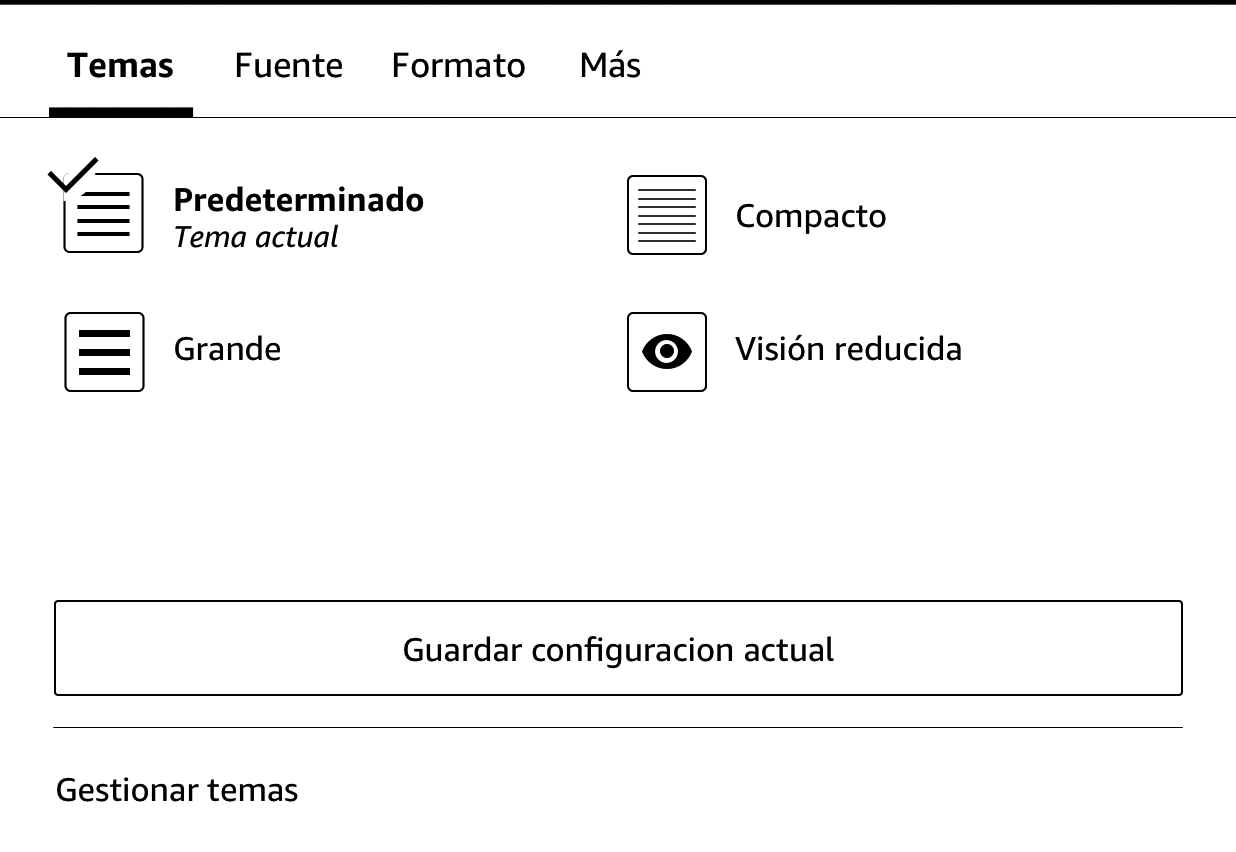 Pulsa esta opción para acceder a la configuración que te permitirá personalizar la forma en la que usas el Kindle. También puedes acceder a Configuración pulsando en el icono Menú y después seleccionando Configuración.