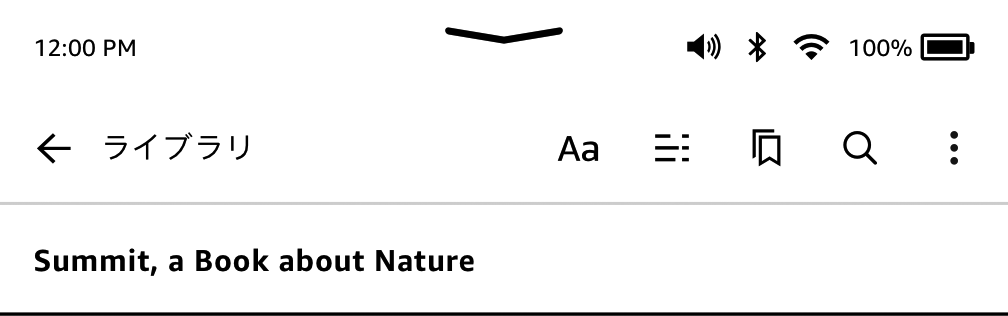 ホーム画面の一番上には、Kindle Paperwhiteの各ステータスを表すアイコンが表示されます。 本やドキュメントを開いた状態でこれらのアイコンを表示するには画面の最上部をタップします。