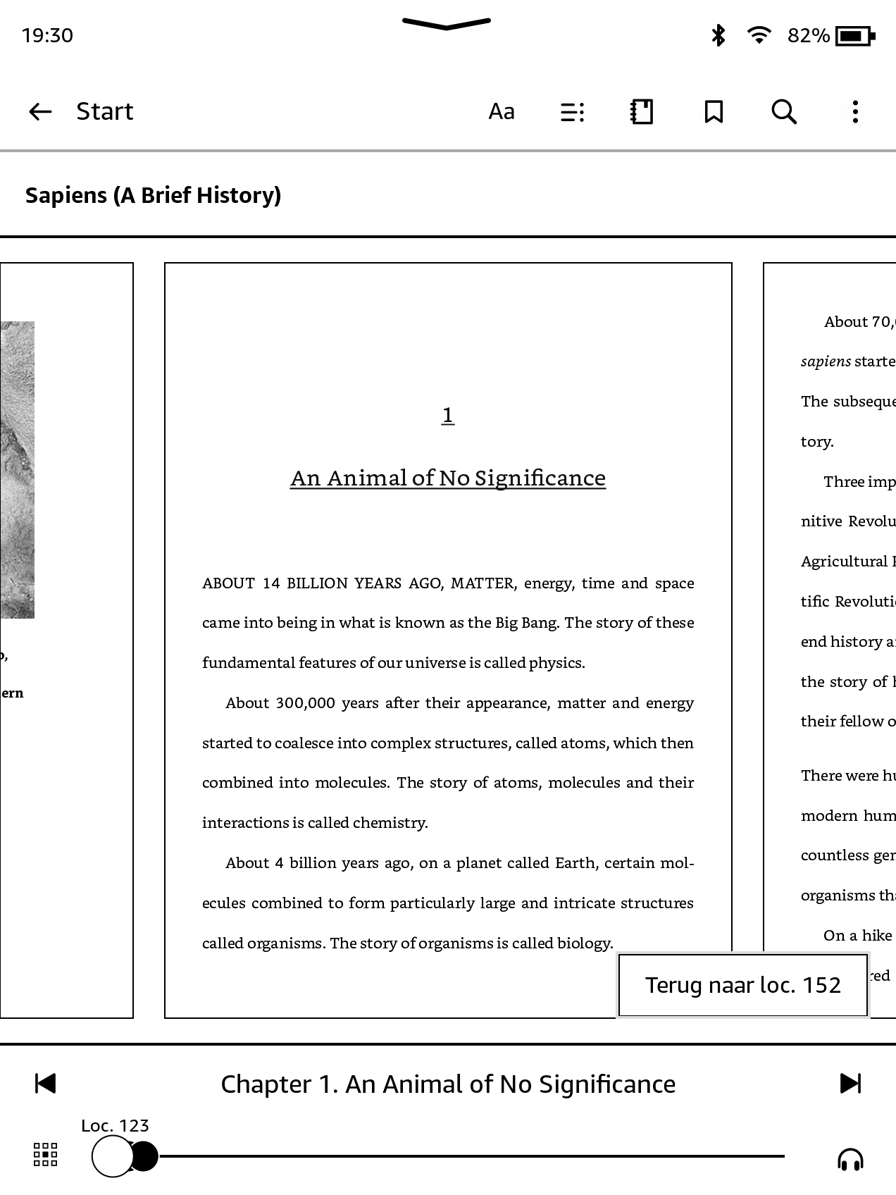 Wanneer je op de bovenkant van het scherm tikt, wordt de naam van het hoofdstuk (indien beschikbaar) ook weergegeven in de leesnavigatiewerkbalk.