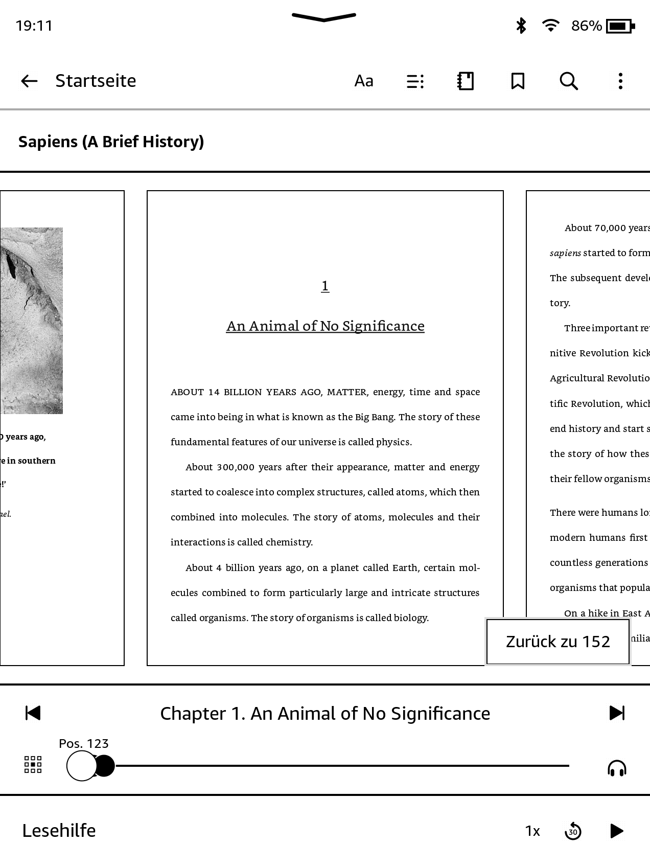 Wenn du den oberen Bildschirmrand antippst, wird in der Lese-Navigationsleiste auch der Kapitelname (sofern verfügbar) angezeigt.