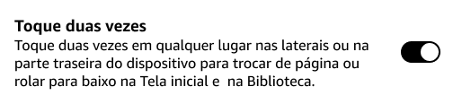 Leitor de tela VoiceView: Permite que você ative e desative o VoiceView. O leitor de tela VoiceView permite que você navegue pelo Kindle usando gestos especiais, receba orientação falada quando interagir com itens na tela e escute milhares de eBooks.