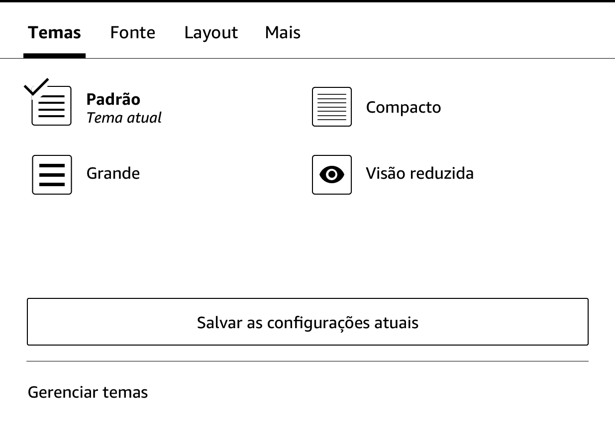 Tamanho da tela e do texto: Você pode alterar o tamanho da fonte da interface de usuário do seu Kindle para facilitar a leitura. Selecione Padrão para usar o tamanho da fonte e layout padrão. Selecione Grande para aumentar o tamanho e ter uma melhor legibilidade nas áreas principais do Kindle. Isto afetará a quantidade de conteúdo exibido em algumas páginas.