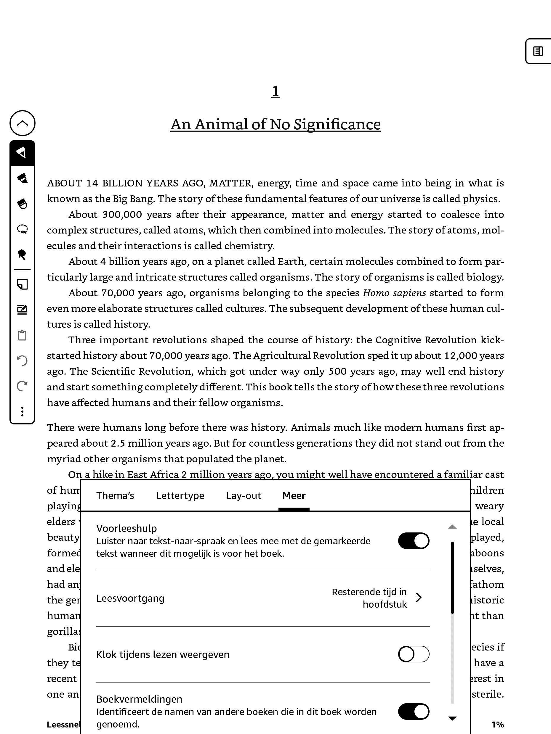 Voorleeshulp wordt automatisch gepauzeerd wanneer je stopt met lezen, bijvoorbeeld wanneer je het navigatiemenu opent of een aantekening maakt (markeringen of notities).