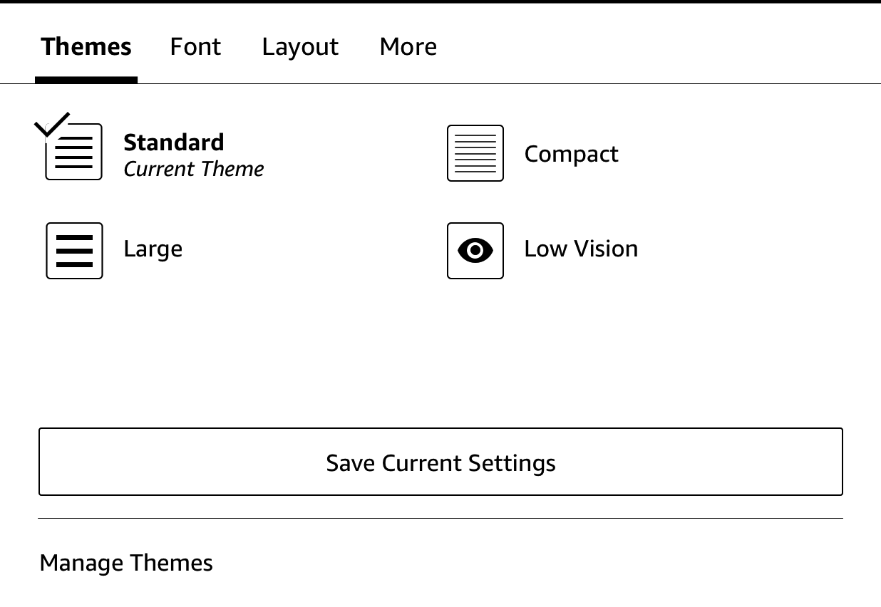 Layout size: Enables you to customise your page layout and display preferences. Select Standard to use the default font size and layout. Select Large to increase font size and help with better readability in few key areas of your Kindle. This will affect the amount of content that is displayed on some pages. The large mode will be unavailable in these areas: Store, Search and Vocabulary Builder.