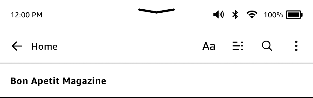 At the top of the Home screen, you'll see indicators that inform you about the status of your Kindle Scribe (3rd Generation). To view these indicators within a book or document, tap the top of the screen to display the toolbars.