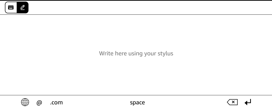 Your Kindle Scribe Colorsoft (1st Generation) has an onscreen keyboard. When you tap within the Search field or begin other actions that require you to type in information, the keyboard automatically displays at the bottom of the screen. You can use the onscreen keyboard in two modes - tapping or writing mode. You will be able to toggle between these modes by simply using the icons on the top left hand corner of the onscreen keyboard