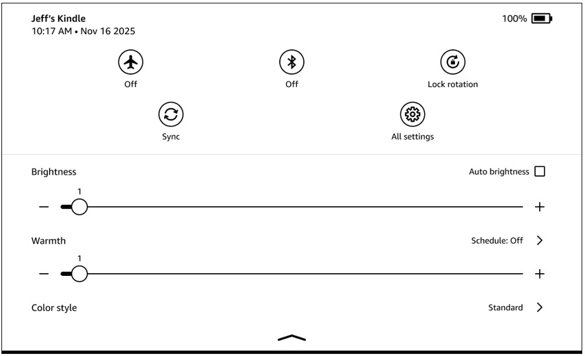 Tap or swipe down to quickly access controls like Airplane Mode, Bluetooth, Sync my Kindle, and All Settings.