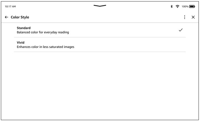 is added to your keyboard when you have enabled multiple languages in settings. To select a different keyboard language, tap the Globe key.Kindle Scribe Colorsoft (1st Generation) comes with two color styles - Standard and Vivid. You can find this setting under All Settings -> Screen and Brightness -> Color Style. Alternatively, you can access this setting page from quick actions by taping on the arrow next to the mode you currently have set. Standard mode is great for everyday reading, and delivers the maximum detail in all pictures. Vivid mode enhances color in many images, making colors feel punchier. It can also cause some shifts in the image, or result in a lack of details in some areas. Try both to see which you prefer, since content quality will impact which of these modes looks best.
